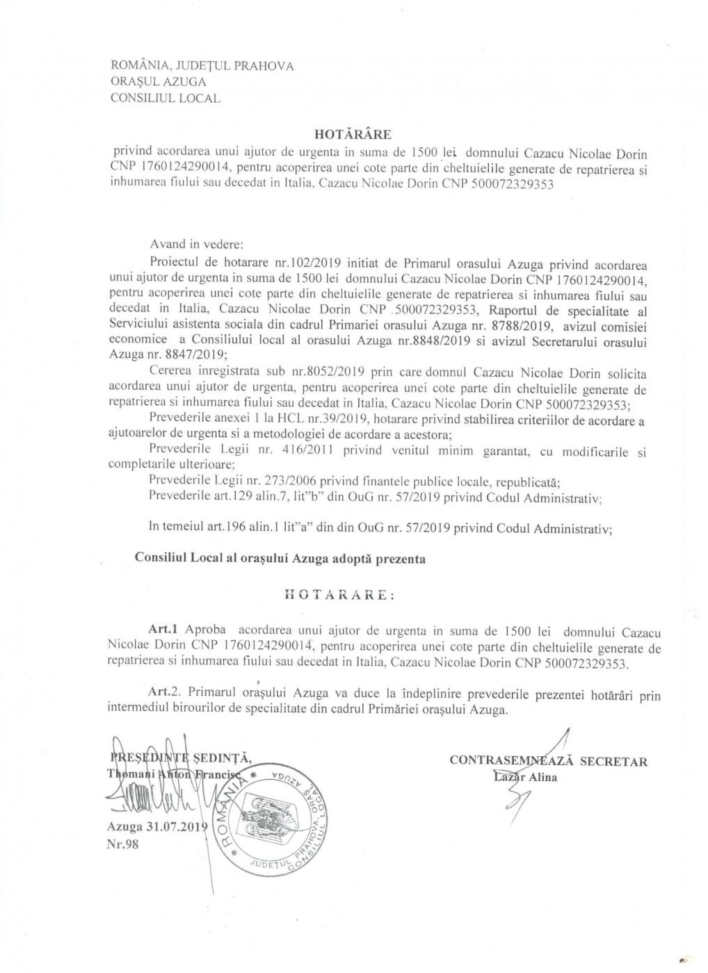 HCL nr. 98/31.07.2019 privind acordarea unui ajutor de urgenta in suma de 1500 lei dlui Cazacu Nicolae Dorin