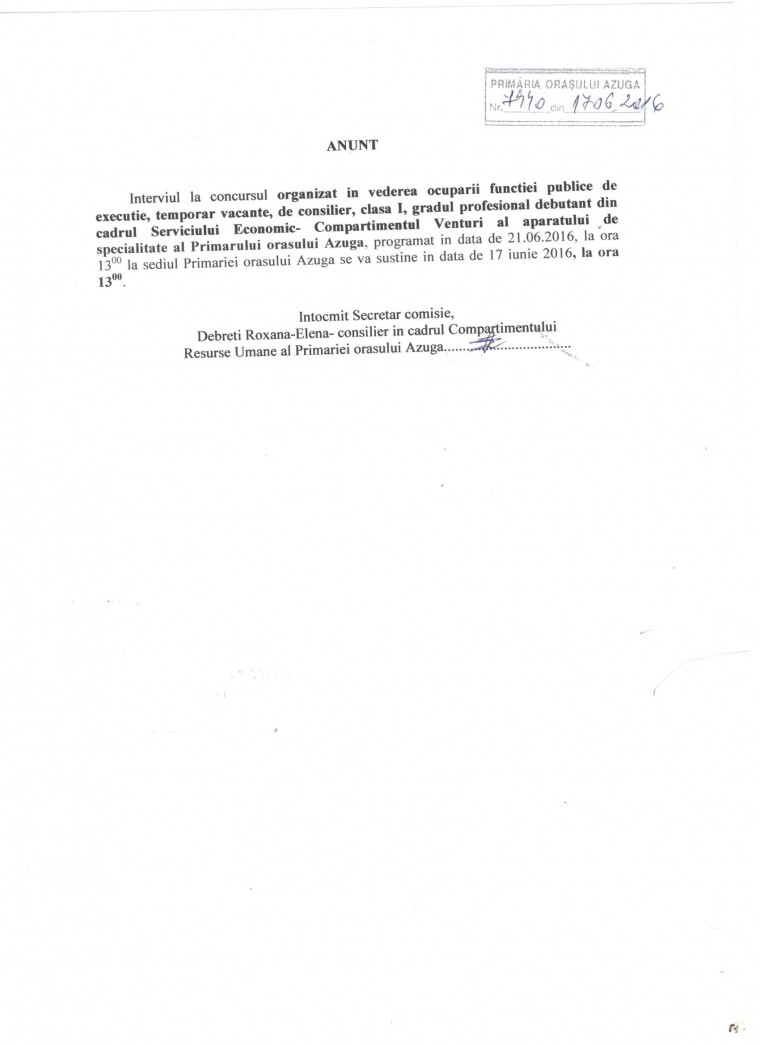 Anunt organizare concurs consilier superior investitii