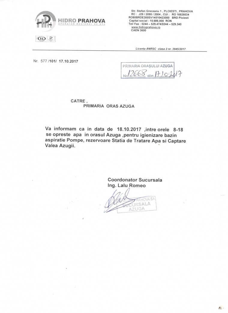 Informare în privința solicitării avizului Sistemului de Gospodărire a Apelor Prahova pentru ”Actualizare PUG și RLU – Oraș Azuga”
